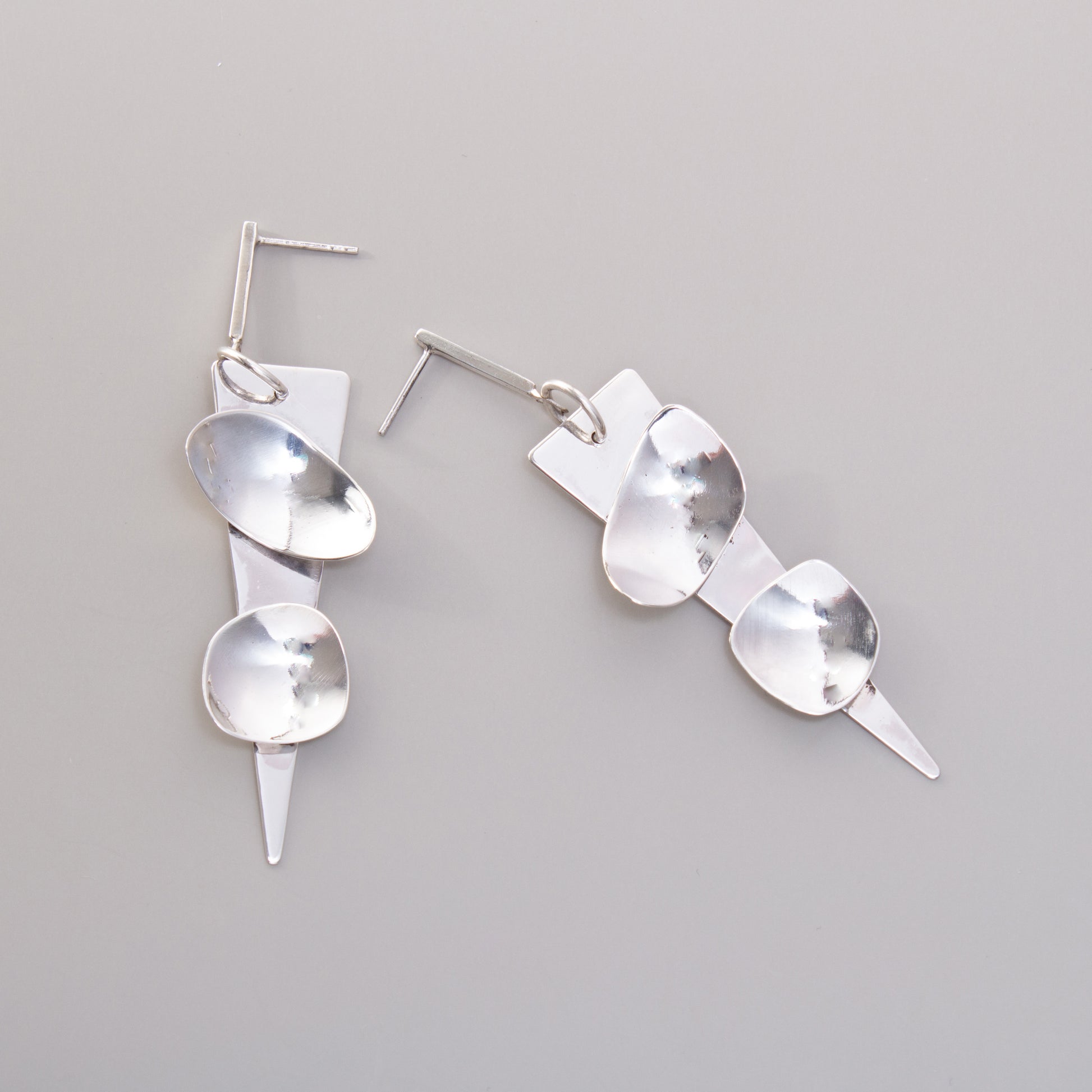 Organic forms are married with geometric angles to create these statement earrings in silver.