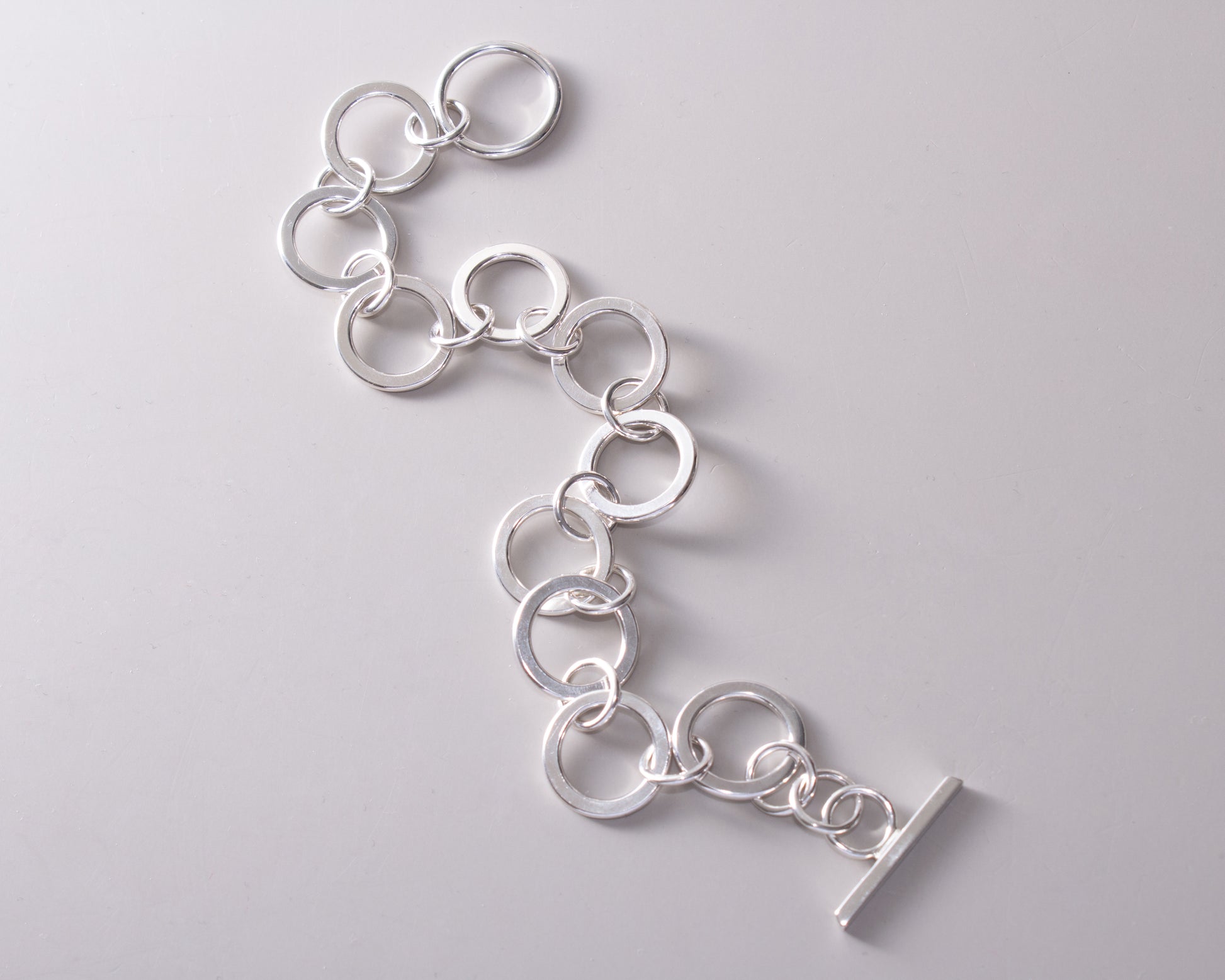 Varje länk formas och färdigställs för hand, vilket skapar naturliga variationer som fångar ljuset och ger ett lugnt, balanserat uttryck. Ytan behåller spår från tillverkningsprocessen och ger en taktil känsla som utvecklas över tid.